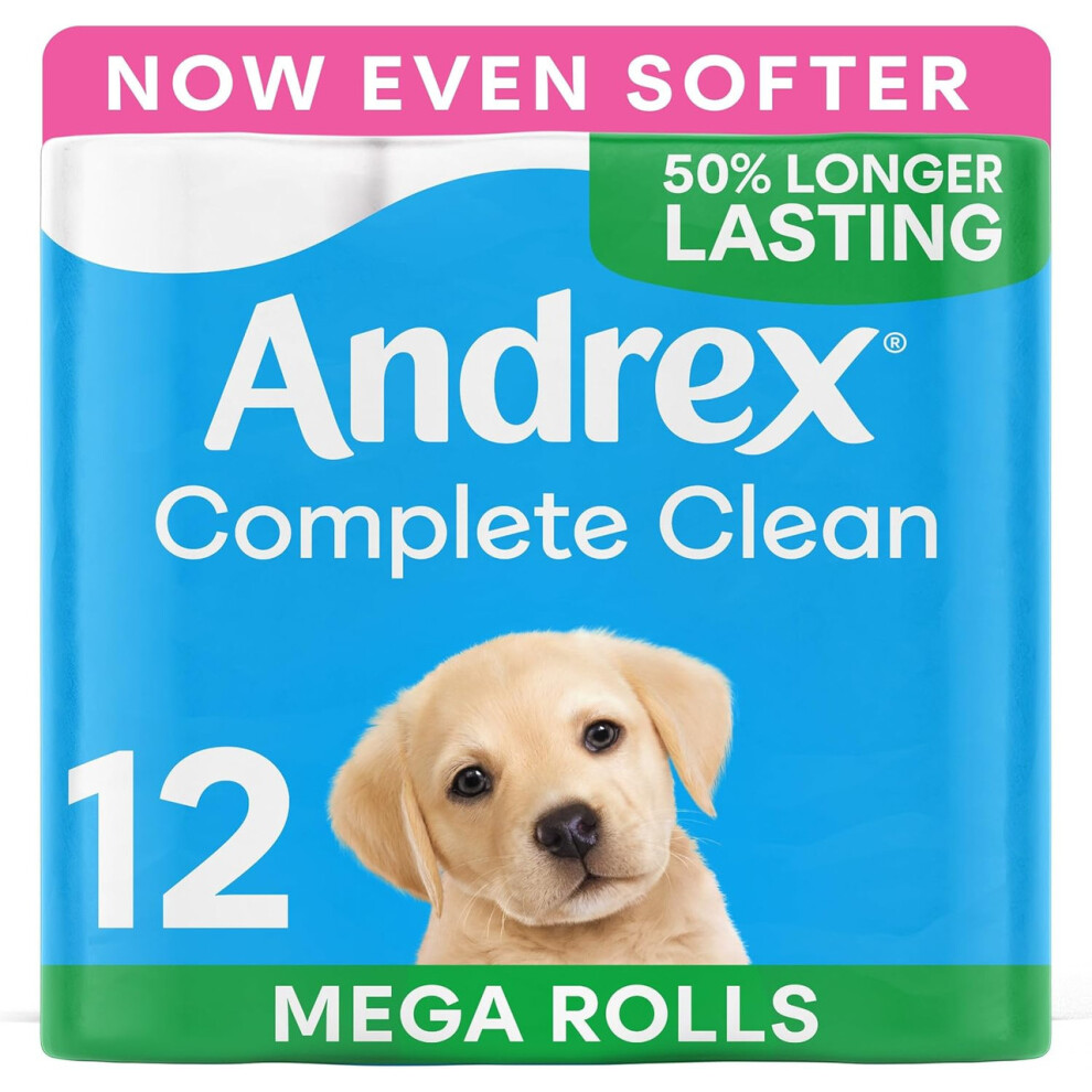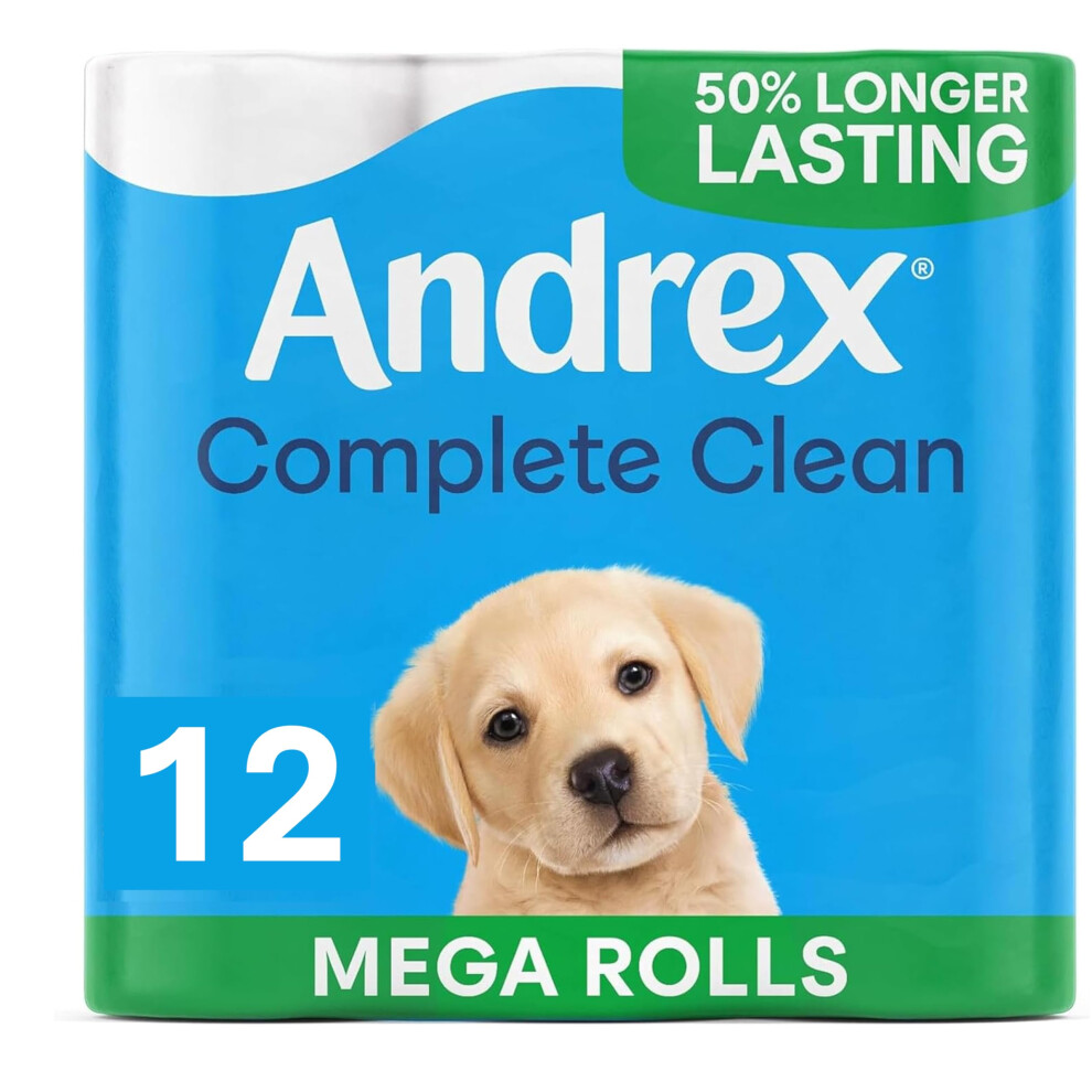 Andrex Complete Clean 12 Mega Toilet Rolls â Equals 18 Standard Rolls â 50% Longer Lasting â Unique 3D Wave â FSC Certified