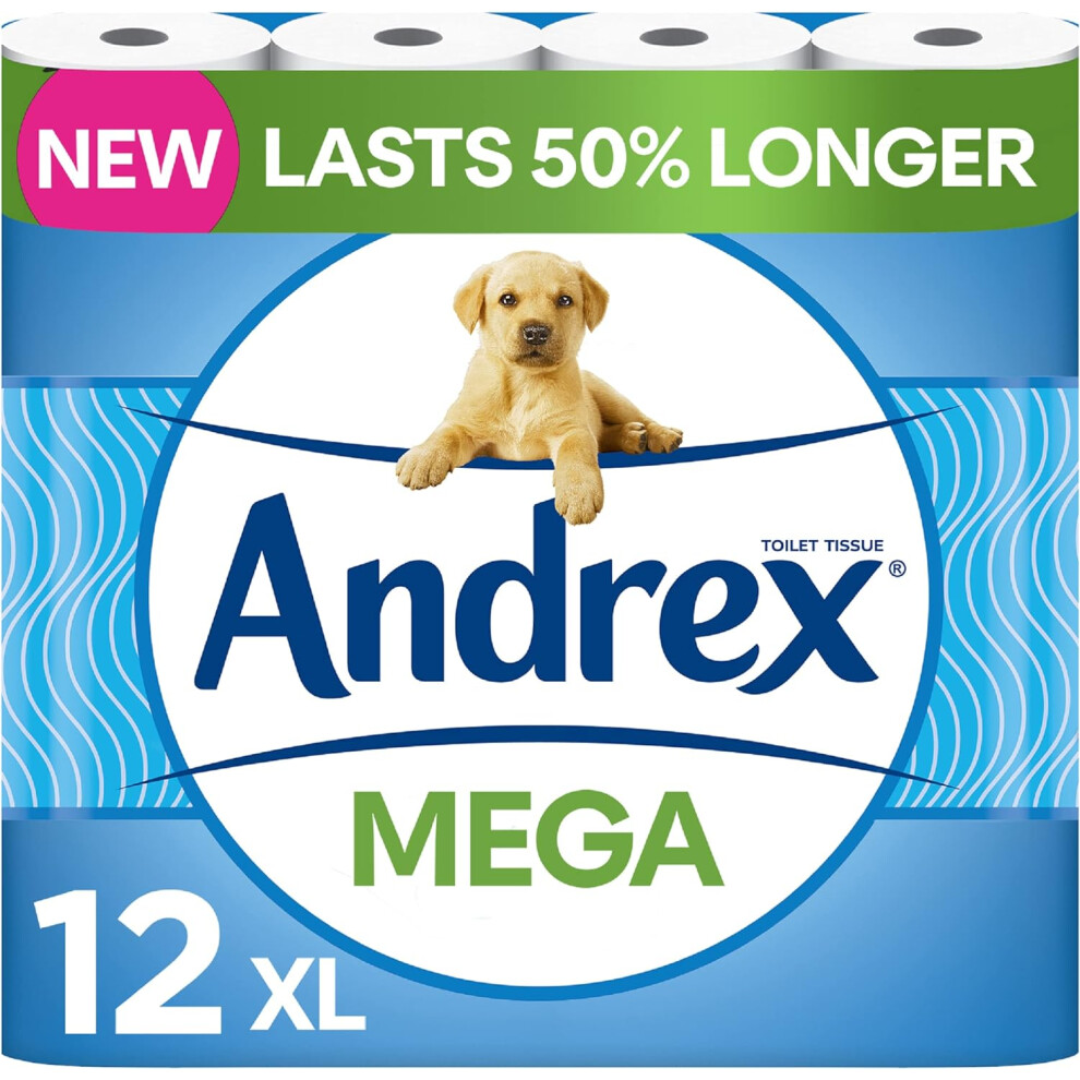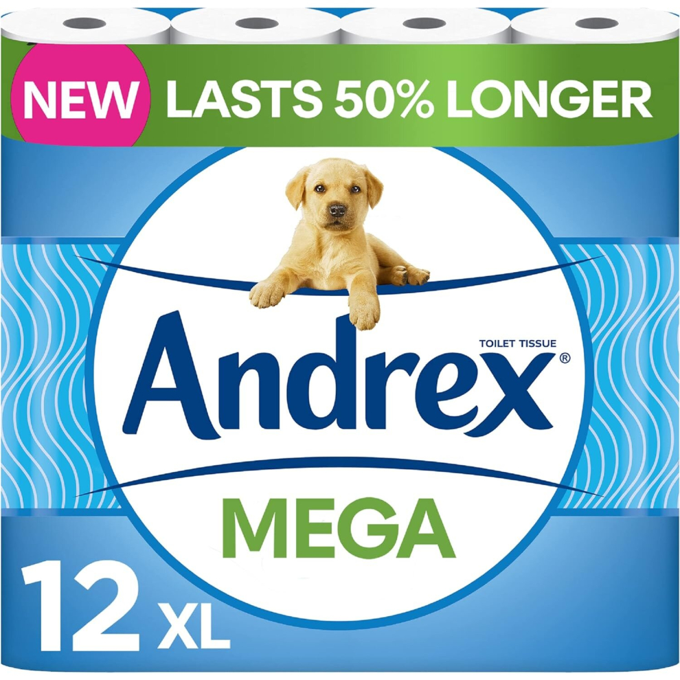 Andrex Classic Clean Mega Toilet Roll - 12 Mega XL Rolls - Same Quality Toilet Roll, Lasts Even Longer, 12 Mega Toilet Rolls = 18 Standard Toilet