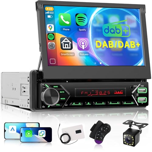 DAB/DAB+ Single Din Car Radio with Wireless Carplay Android Auto, 7 inch Electric Flip Out Touch Screen 1 Din Car Radio with Bluetooth EQ Mirror Link FM USB Type-C AUX Backup Camera