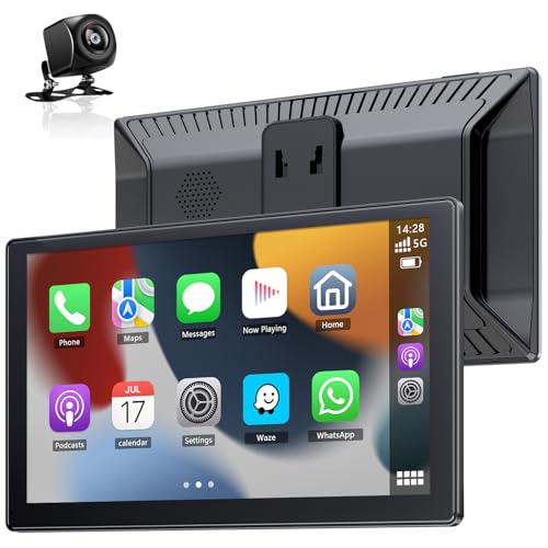Portable Car Stereo, Wireless Apple Carplay & Android Auto, 1080P HD Touch Screen Radio with BT 5.0, Mirror Link Support Truck & RV Dash Mount (7 Inch + Camera)