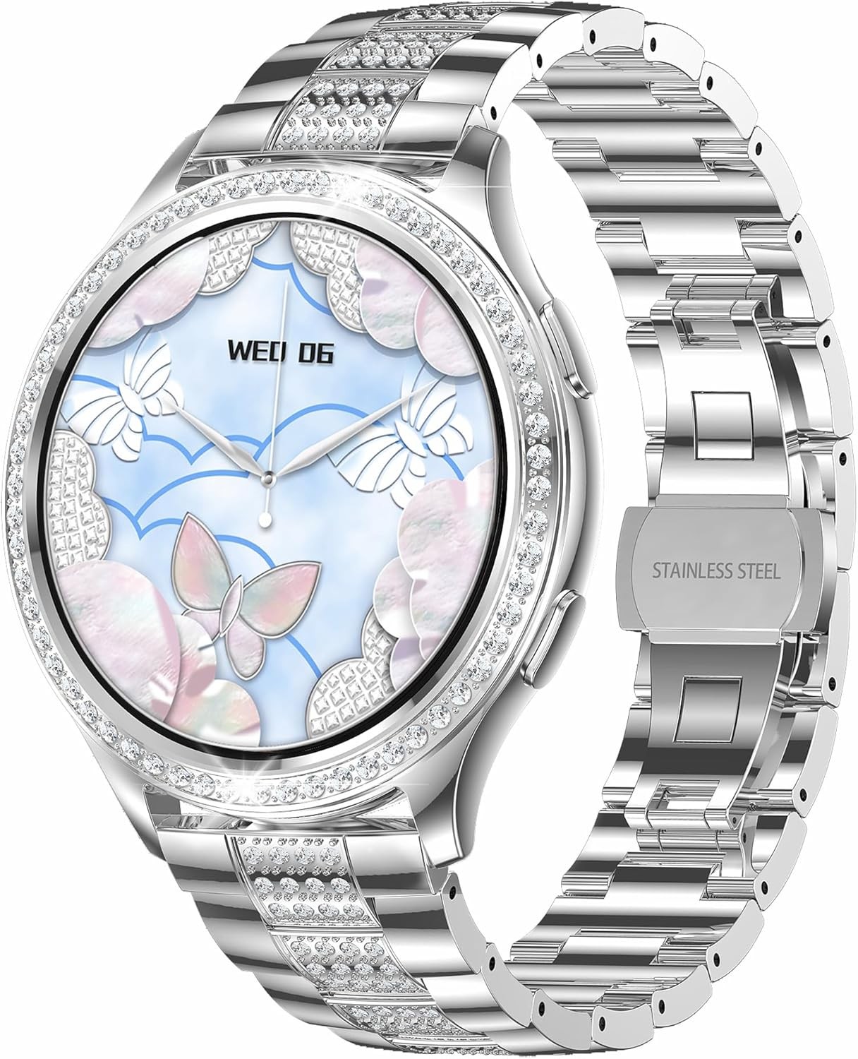 Smart Watches for Women, 1.19" AMOLED Always-on Display Diamond Smart Watch with Bluetooth Call, Blood Pressure/SpO2/Heart Rate Monitor, Waterproof Pedometer Silver Ladies Smartwatch for Android iOS