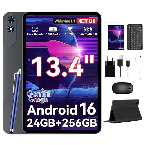 13 Inch Large Android 16 Tablet with Keyboard, Mouse & Case Kit, 13.4 Inch Tablet with 120Hz FHD+ Display, 24GB+256GB (Expandable to 2TB), 10000mAh Battery, 16MP Camera, GPS, for Work & Entertainment