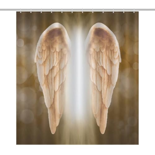 Nugier Shower Curtain with 12 Hooks, Waterproof Bath Curtain Liner Machine Washable Polyester Tub Stall No Smell 64"(W) x72(H) Print Golden Gold Angel Wings