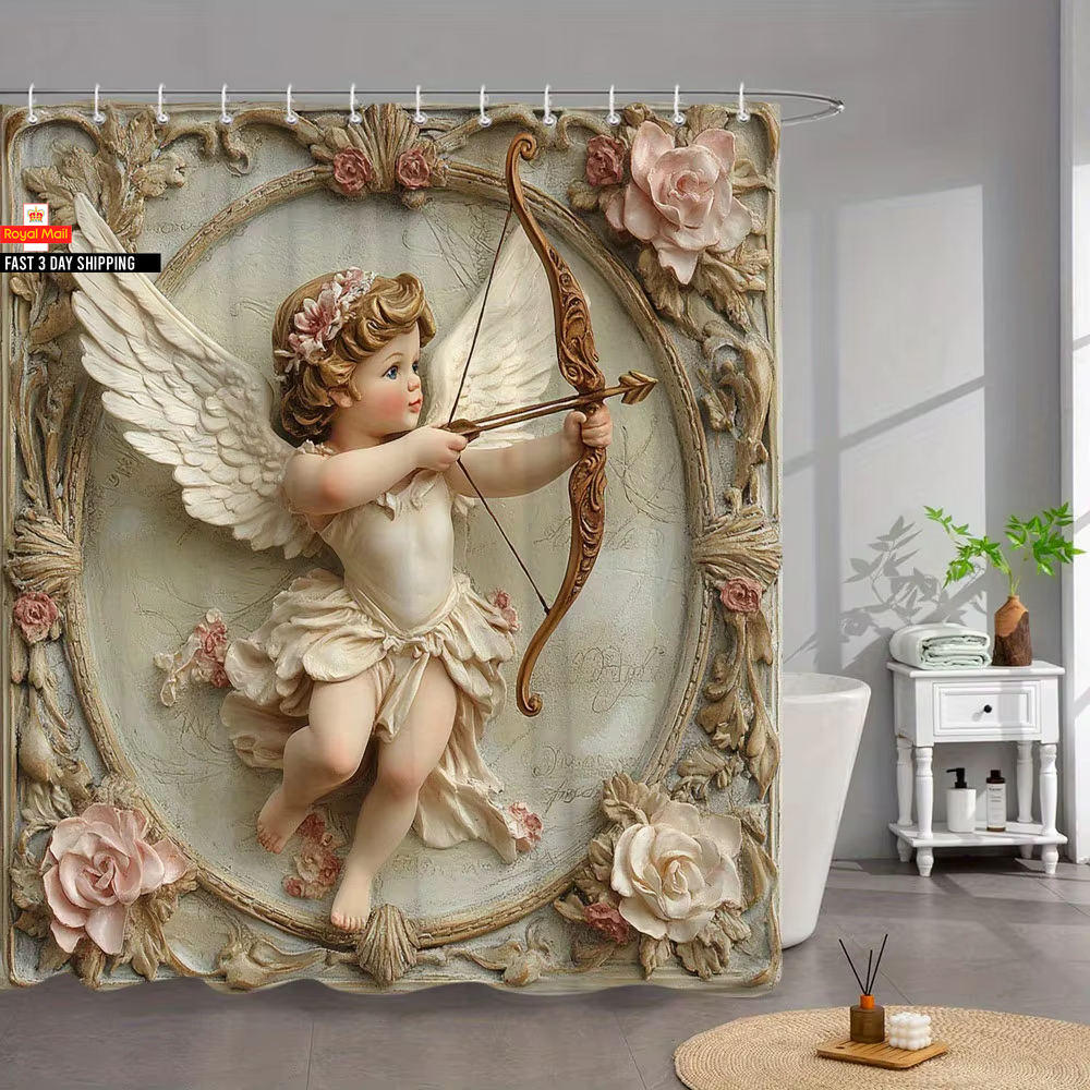 1Pc Shower Curtain - Vintage Angel with Bow and Roses Design for a Romantic Bath