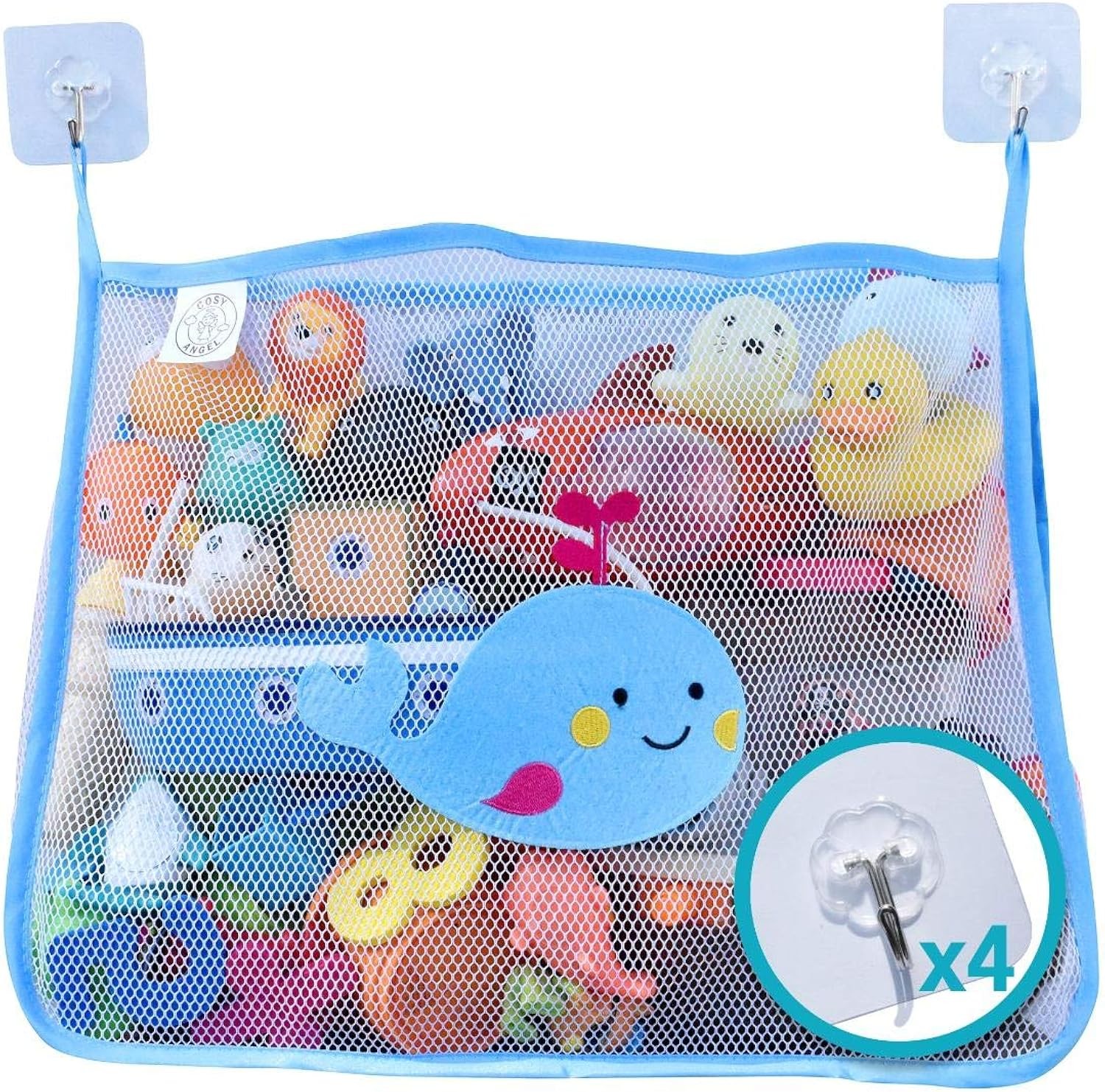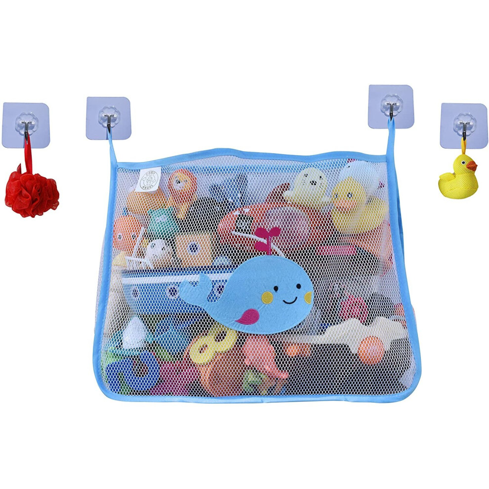 COSY ANGEL Baby Bath Toy Bag for Bath Toys Large Organiser Bathroom Storage Net with 4 Waterproof Self Adhesive Hooks (Blue)