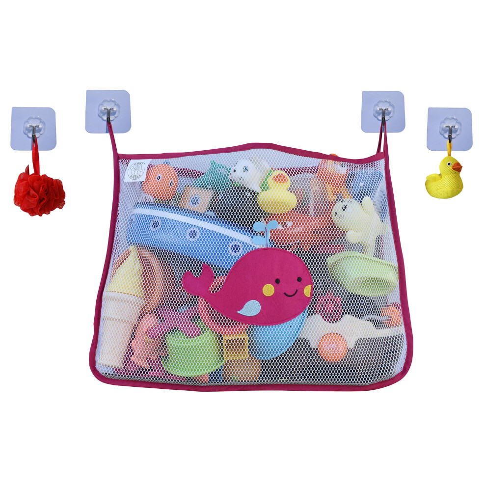 Baby Bath Toy Bag for Bath Toys Large Organiser Bathroom Storage Net with 4 Waterproof Self Adhesive Hooks (Pink)
