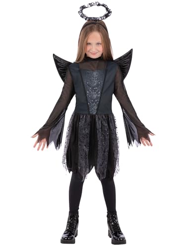 Smiffys Girls Dark Angel Halloween Costume Black Fallen Angel Dress with Wings and Halo Gothic Fancy Dress Outfit for Kids Trick or Treat Devil Fairy Demon Party Look, Age 7-9