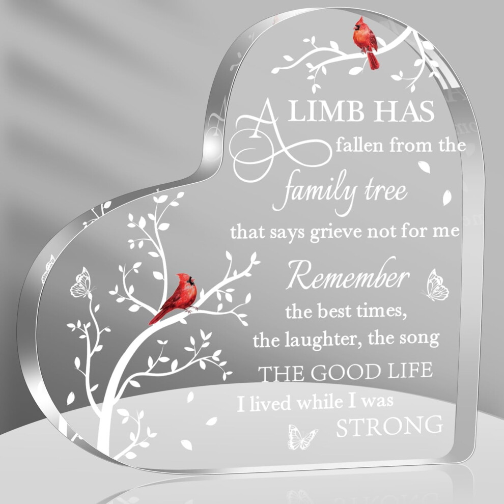 Sympathy Plaque: "A Limb Has Fallen from The Family Tree" â Acrylic Heart Memorial Gift, Angel & Red Cardinal Table Decor, Compatible with