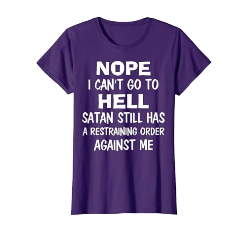 Nope I Can't Go to Hell Satan Still Has A Restraining Order T-Shirt, Women, Purple, Medium