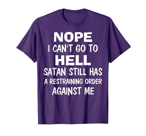 Nope I Can't Go to Hell Satan Still Has A Restraining Order T-Shirt, Men, Purple, Large