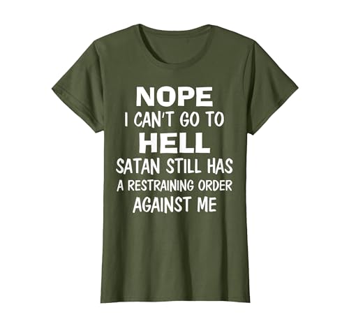 Nope I Can't Go to Hell Satan Still Has A Restraining Order T-Shirt, Women, Olive Green, Small
