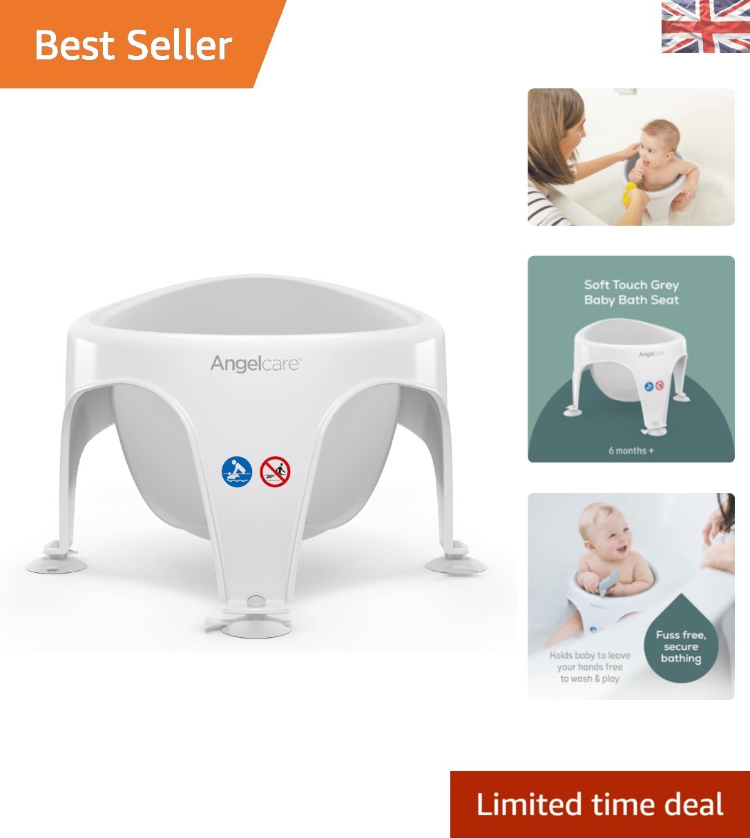 Angelcare Soft Touch Baby Bath Support -Grey- Water Level Indicator,