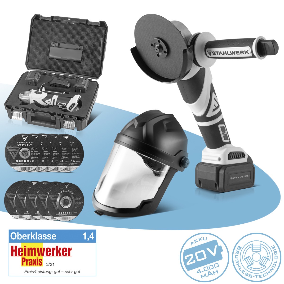 STAHLWERK 20 V angle grinder 4 Ah battery charger Tool case Sanding helmet