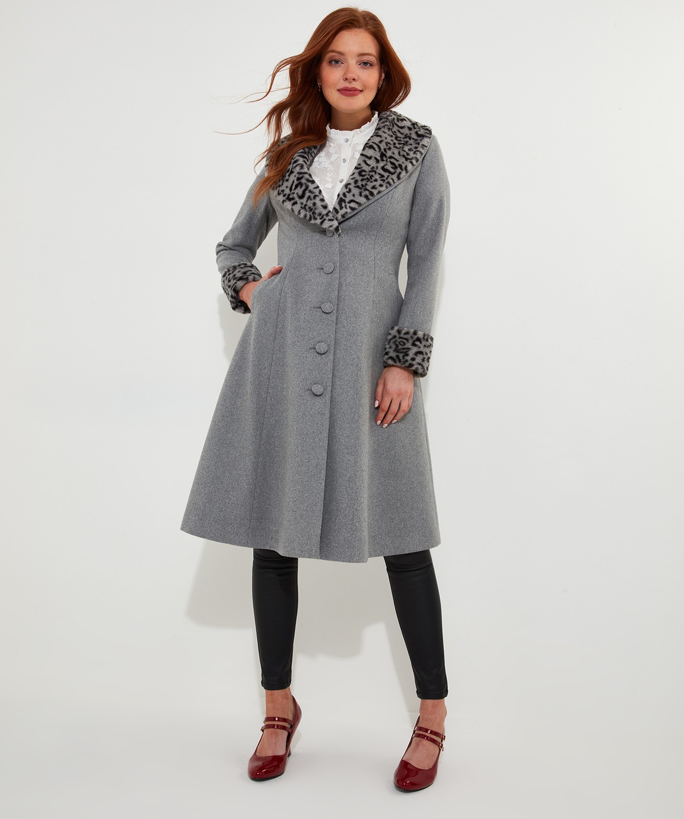 Joe Browns Women's Animal Print Faux Fur Trim Long Coat, Grey, 8