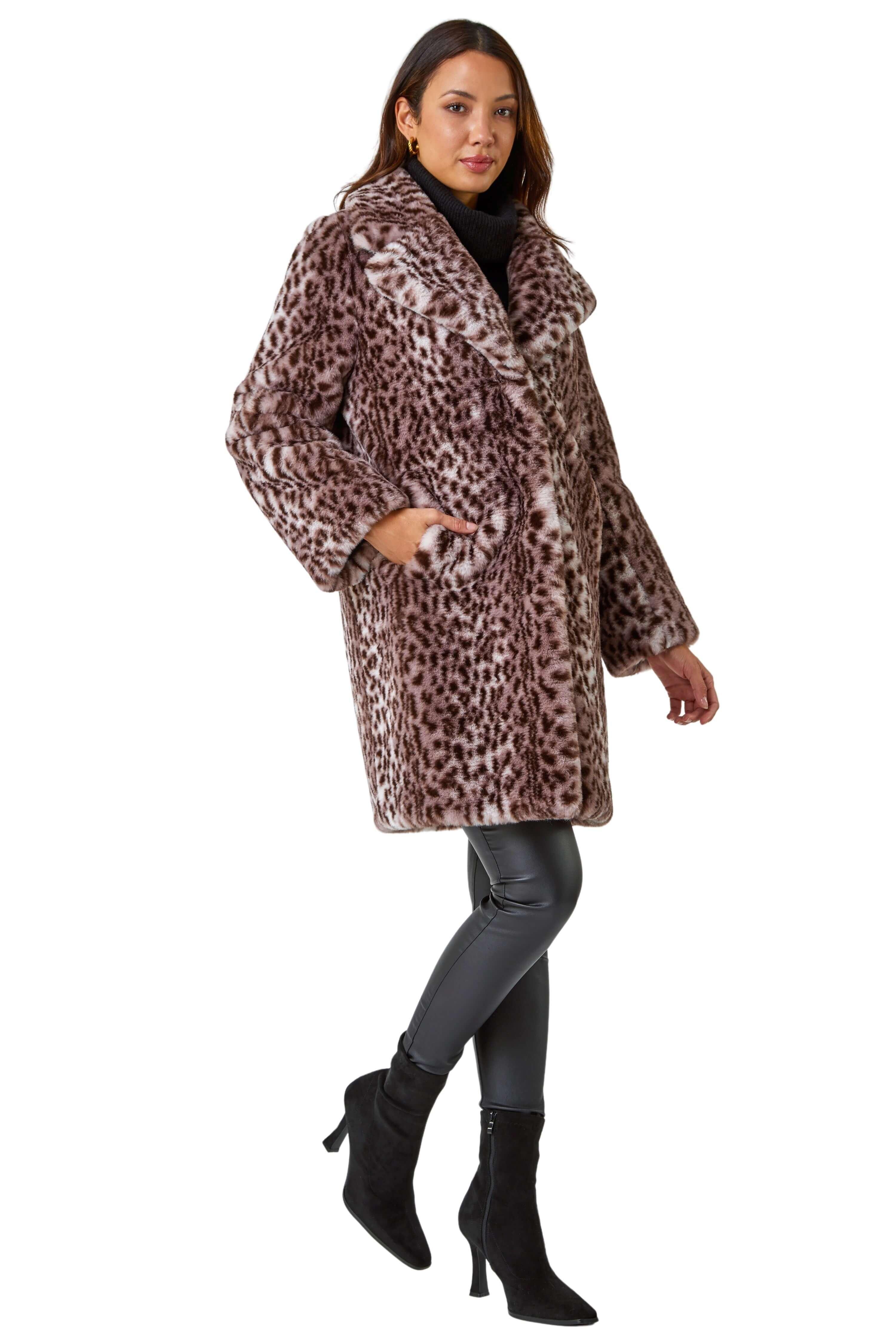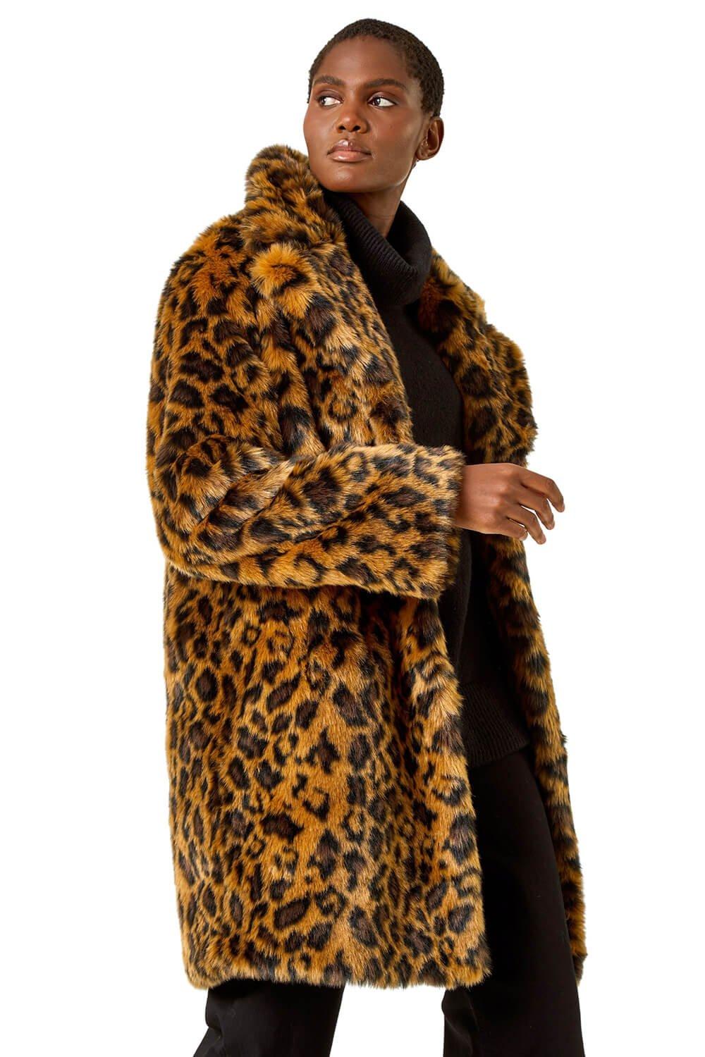 Roman Womens Premium Animal Print Faux Fur Coat - Tan Faux Leather - Size 12 UK