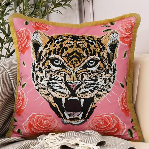 Tiger Floral Velvet Decorative Throw Pillow Cover 18x18 In Pink Pillow Covers Flower Animal Print Tiger Cushion Cover with Tassels Modern Decor Square Pillowcase for Sofa Couch Bedroom Living Room
