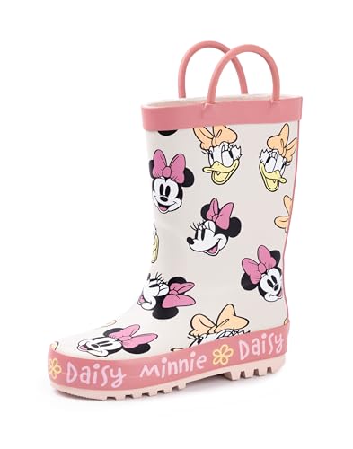 Disney Minnie Mouse Girls Wellington Boots | Kids Handle Wellies Minnie & Daisy Character All Over Print in Beige & Pink | Water Resistant Easy Pull On Rubber Boots for Children | Animation Movie Gift