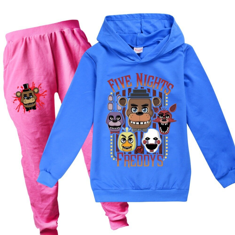 (Dark Blue Top + Pink Pants, 13-14Y) FNAF anime hoodie + trousers autumn and winter boys and girls fashion casual children's clothing