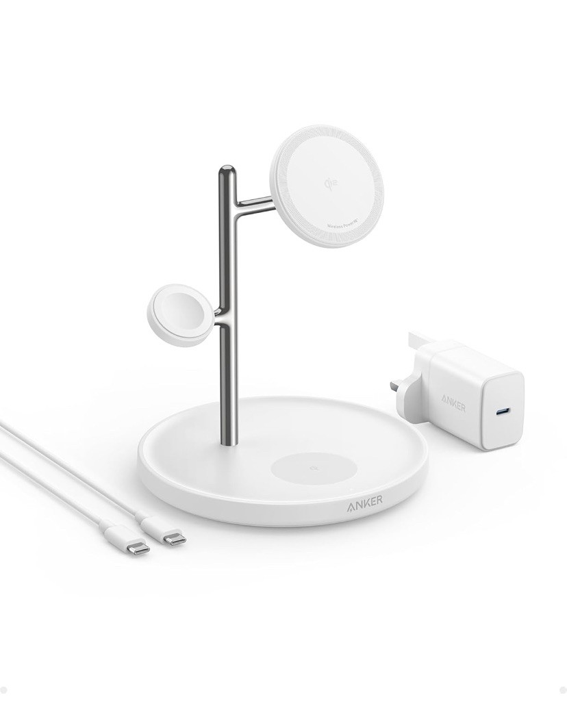 Anker 3-in-1 Wireless Charging Station, MagSafe Charger Compatible, Qi2 Certified 15W Wireless Stand, For iPhone 16/15/14 Series, AirPods Pro, Apple Watch Ultra (USB C Charger and Cable Included)