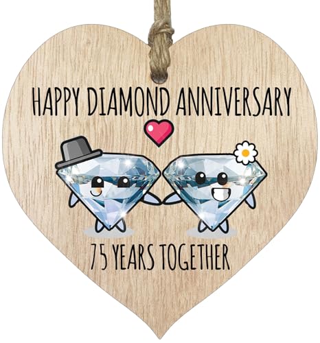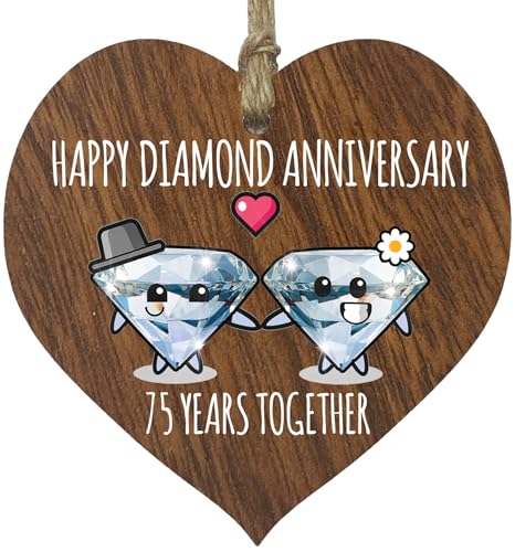 75th Wedding Anniversary Plaque Gift for Husband Wife - 75 Years Together - Happy Diamond Anniversary Wooden Heart for Women Men Partner, Light Wood Sign Keepsake Gifts