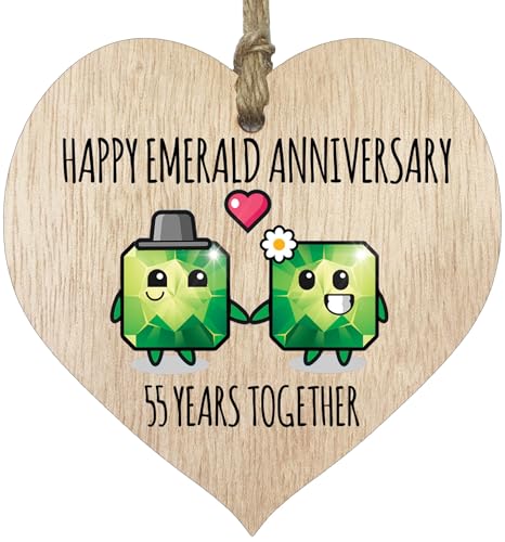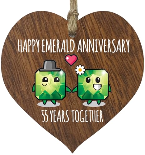 55th Wedding Anniversary Plaque Gift for Husband Wife - 55 Years Together - Happy Emerald Anniversary Wooden Heart for Women Men Partner, Light Wood Sign Keepsake Gifts
