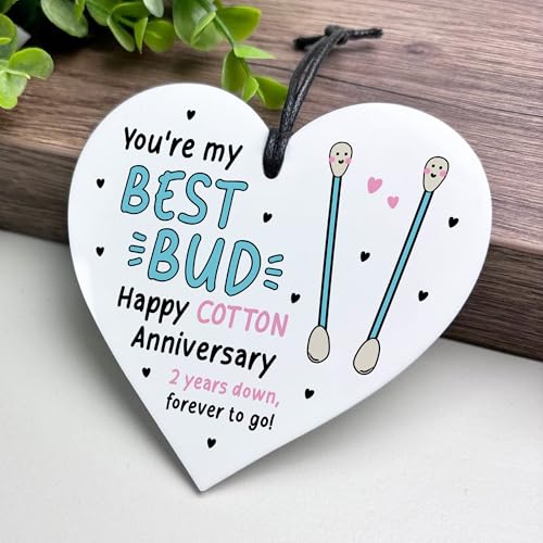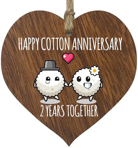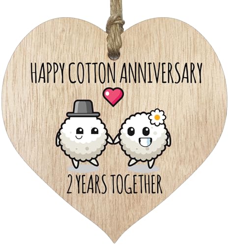 2nd Wedding Anniversary Plaque Gift for Husband Wife - 2 Years Together - Happy Cotton Anniversary Wooden Heart for Women Men Partner, Light Wood Sign Keepsake Gifts