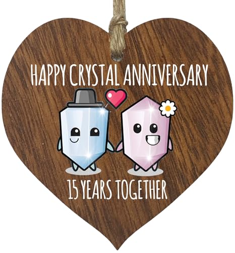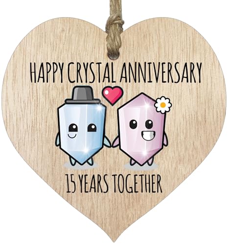15th Wedding Anniversary Plaque Gift for Husband Wife - 15 Years Together - Happy Crystal Anniversary Wooden Heart for Women Men Partner, Light Wood Sign Keepsake Gifts