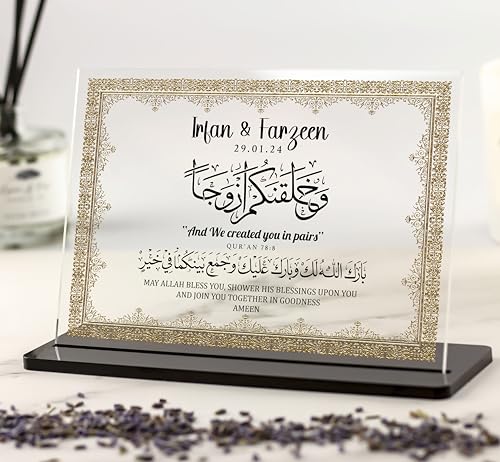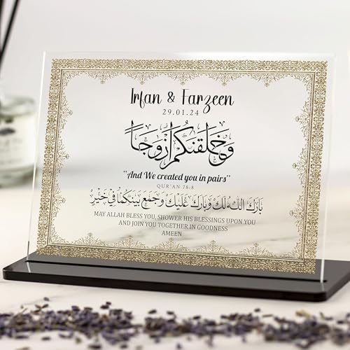 Personalised Nikkah Certificate Style Gift for Muslim Couple, Islamic Wedding Gift, Anniversary gift for Husband Wife, And We Created You in Pairs Arabic Quote, Engagement, Clear Acrylic Plaque