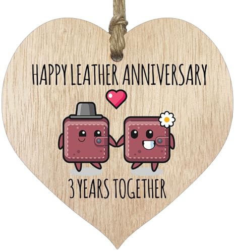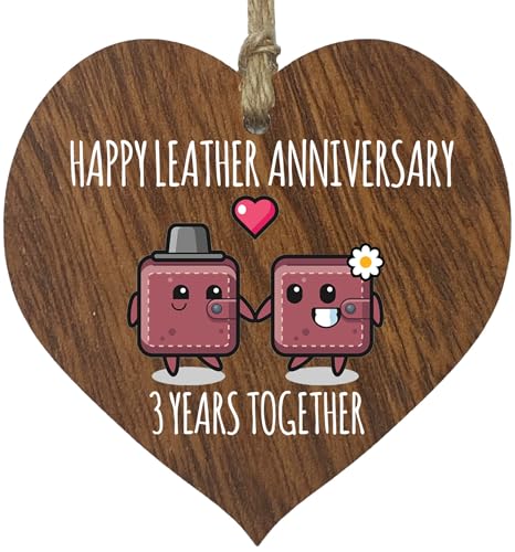 3rd Wedding Anniversary Plaque Gift for Husband Wife - 3 Years Together - Happy Leather Anniversary Wooden Heart for Women Men Partner, Light Wood Sign Keepsake Gifts