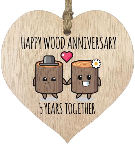 5th Wedding Anniversary Plaque Gift for Husband Wife - 5 Years Together - Happy Wooden Anniversary Wooden Heart for Women Men Partner, Light Wood Sign Keepsake Gifts