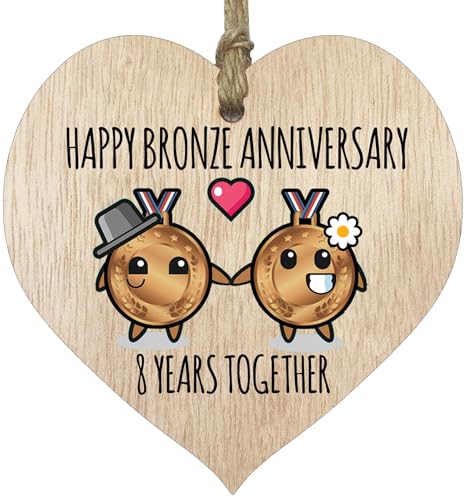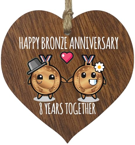 8th Wedding Anniversary Plaque Gift for Husband Wife - 8 Years Together - Happy Bronze Anniversary Wooden Heart for Women Men Partner, Light Wood Sign Keepsake Gifts
