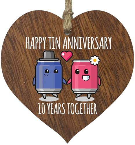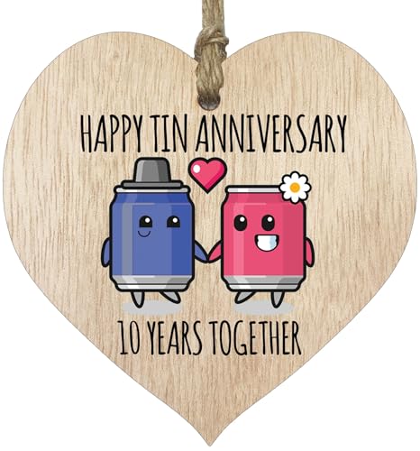 10th Wedding Anniversary Plaque Gift for Husband Wife - 10 Years Together - Happy Tin Anniversary Wooden Heart for Women Men Partner, Light Wood Sign Keepsake Gifts
