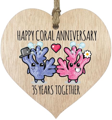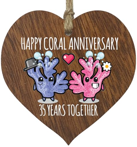 35th Wedding Anniversary Plaque Gift for Husband Wife - 35 Years Together - Happy Coral Anniversary Wooden Heart for Women Men Partner, Light Wood Sign Keepsake Gifts