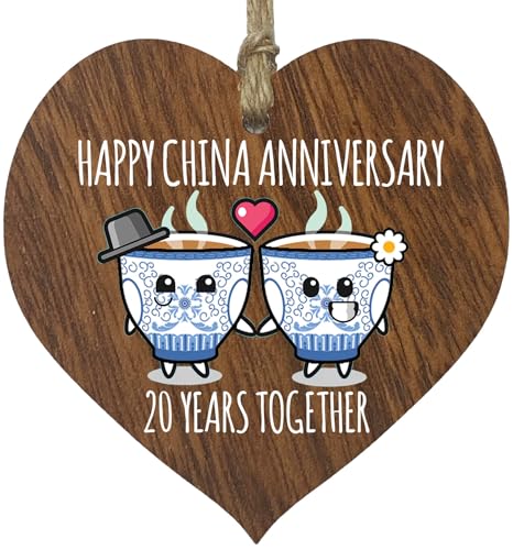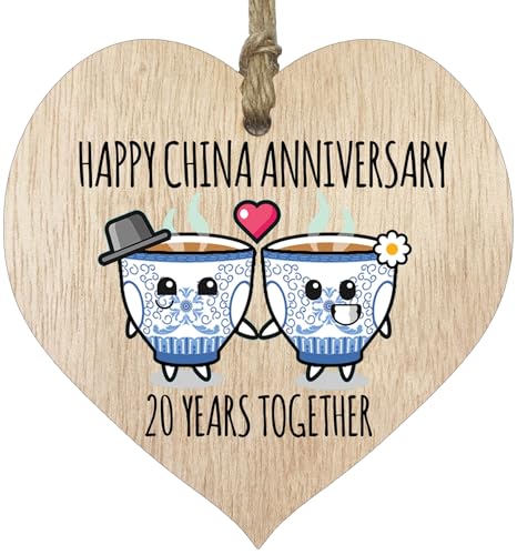 20th Wedding Anniversary Plaque Gift for Husband Wife - 20 Years Together - Happy China Anniversary Wooden Heart for Women Men Partner, Light Wood Sign Keepsake Gifts