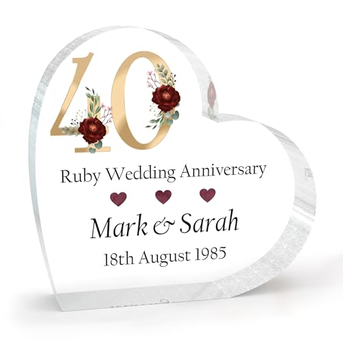 Beecreative Ruby Wedding Anniversary Gifts - Personalised 40th Wedding Anniversary Gift for Couples, Husband, Wife, Parents - Clear Heart Ruby 40th Anniversary Ornament Present with Grey Bag