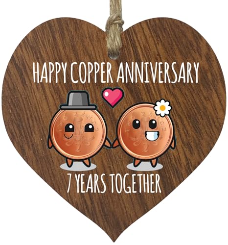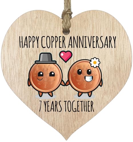 7th Wedding Anniversary Plaque Gift for Husband Wife - 7 Years Together - Happy Copper Anniversary Wooden Heart for Women Men Partner, Light Wood Sign Keepsake Gifts