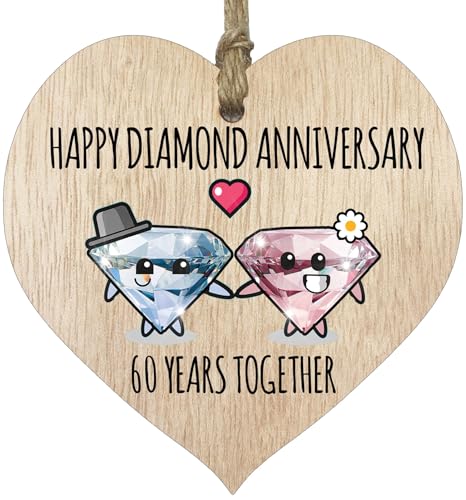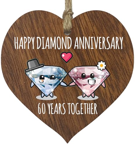 60th Wedding Anniversary Plaque Gift for Husband Wife - 60 Years Together - Happy Diamond Anniversary Wooden Heart for Women Men Partner, Light Wood Sign Keepsake Gifts