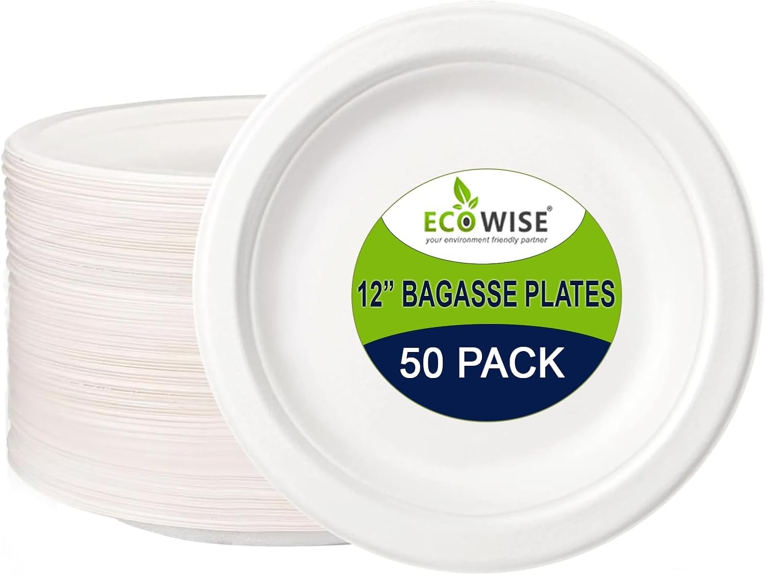 Strong X-Large Round Bagasse Plates, Biodegradable & 12 inch - 50 Pack