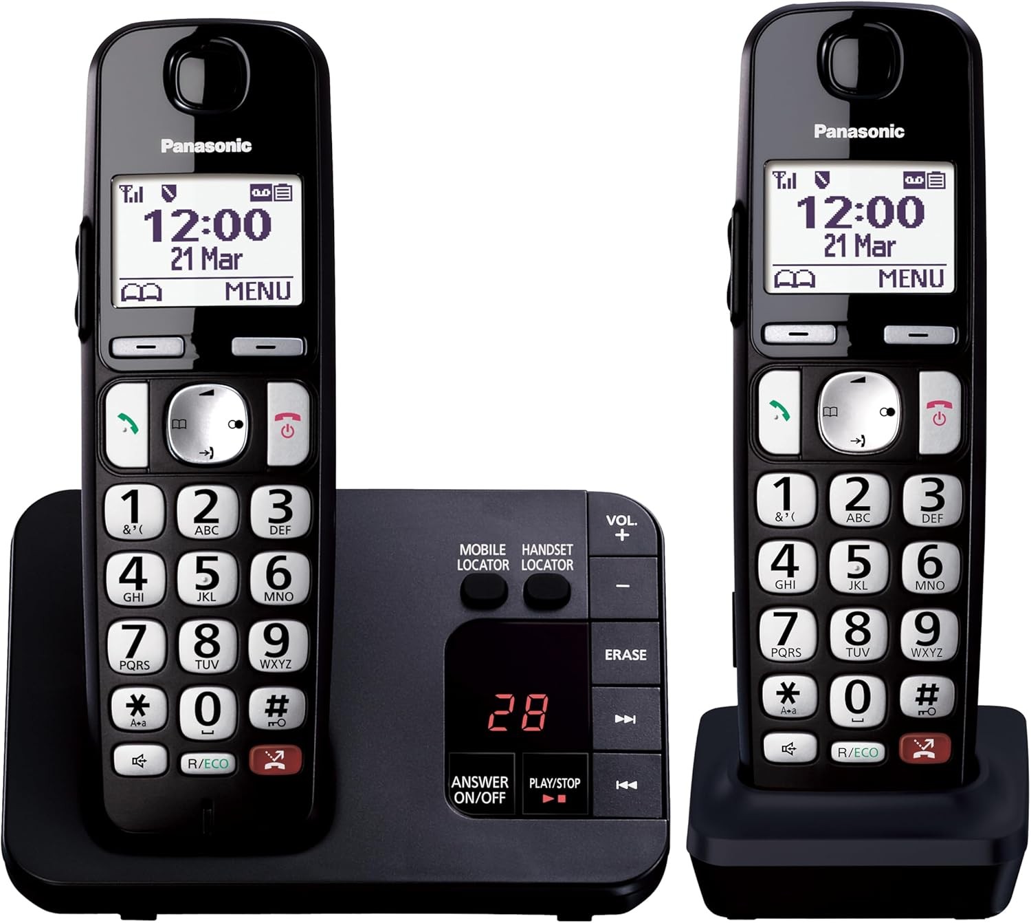 Panasonic KX-TGU432EB Digital Cordless Landline Phone with Answering Machine, Base Unit & 2 Handsets, LCD Display, Fav Call, Torchlight, Hearing Aid Compatible, Black & Silver