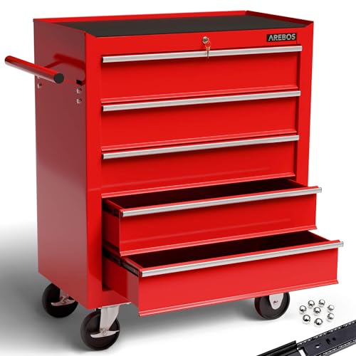 Arebos Workshop trolley 5 compartments | Tool Cabinet on Wheels | with 5 Drawers | Lockable| incl. anti-slip mats | 2 castors with parking brake (red)