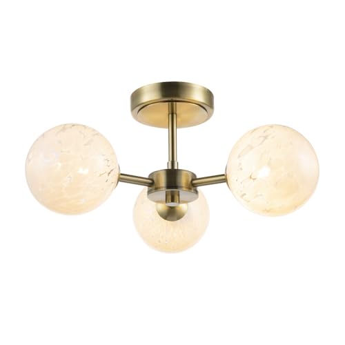 Designer Antique Brass Semi Flush Ceiling Light with White Confetti Snowflake Glass Shades | 19cm x 39cm | 3 x 5w G9 | Class 2 Double Insulated