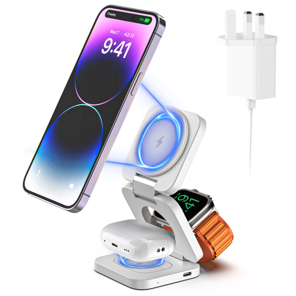 3 in 1 Wireless Charging Station, Foldable Magnetic Charger Stand for iPhone 15/14/13/12 Pro/Plus/Pro Max/Mini, 5W Fast Charger for Apple Watch7/6/5/4