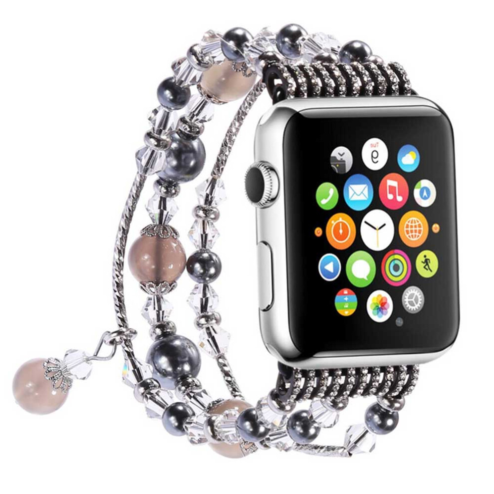 Stylish Beaded Band For Apple Watch, Elastic Bracelet With Natural Pearls And Sparkling Crystals, Bling Bling Design With Comfortable Fit