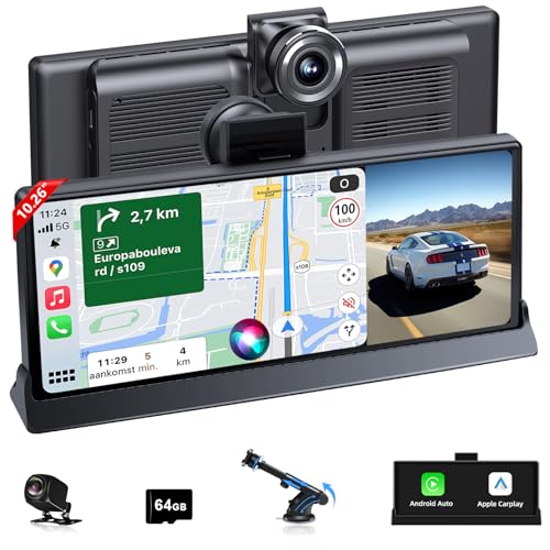 4K Apple Carplay Screen 10.26'' Car Play Screen 350° Rotatable Front Lens Wireless Carplay & Android Auto Car Screen with Dashcam Reversing Camera Dual Bluetooth Mirror Link Voice Control Navigation