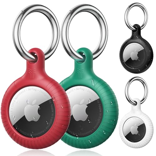 YOSH Airtag Holder Keyring [Twist Lock Design] 4 Pack, TPU & Hard PC Case for Apple AirTag, Car Keys, Bags, Accessories - Green, Red, Black & White