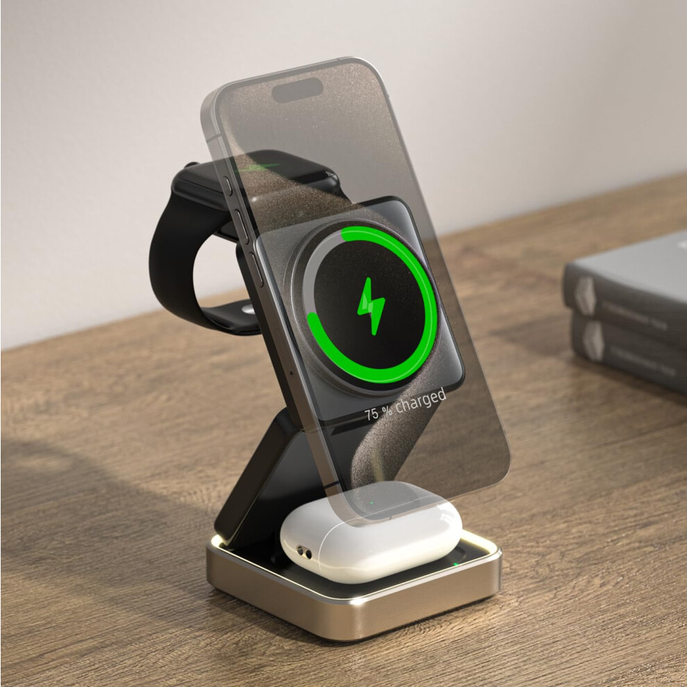 15W 3-in-1 Wireless Charger Stand for iPhone 14/13/12 & Apple Watch, Earbuds, Black