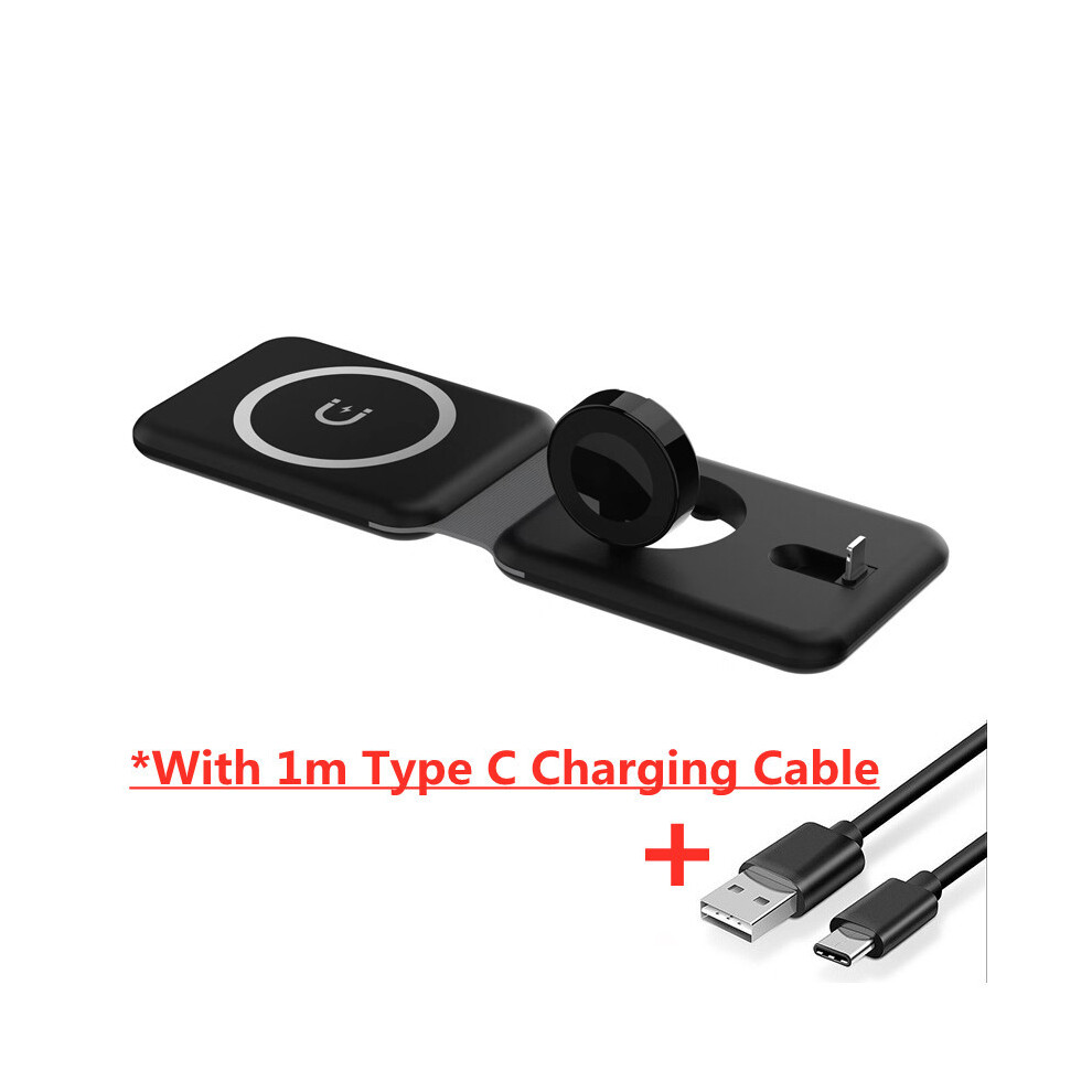 (With Black Cable) 15W 3 in 1 Magnetic Wireless Charging Pad for iPhone 12 13 14 Pro Max Apple Watch