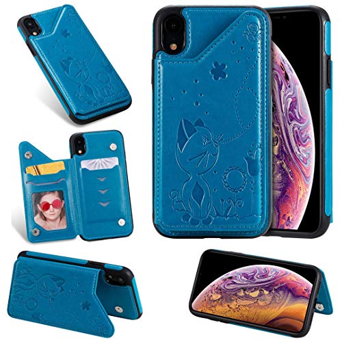 SATURCASE Case for Apple iPhone XR, Cat Bee Embossing PU Leather Flip TPU Magnetic Buckle Wallet Stand Card Slots Protective Cover for Apple iPhone XR (Blue)