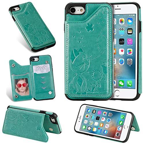 SATURCASE Case for Apple iPhone 7 Plus / 8 Plus, Cat Bee Embossing PU Leather Flip TPU Magnetic Buckle Wallet Stand Card Slots Protective Cover for Apple iPhone 7 Plus / 8 Plus (Green)