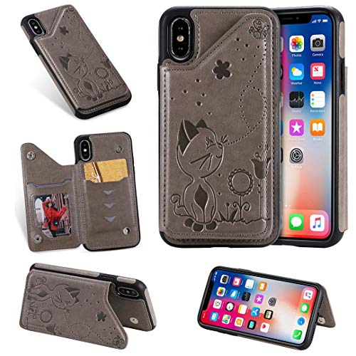 SATURCASE Case for Apple iPhone X/XS, Cat Bee Embossing PU Leather Flip TPU Magnetic Buckle Wallet Stand Card Slots Protective Cover for Apple iPhone X/XS (Gray)